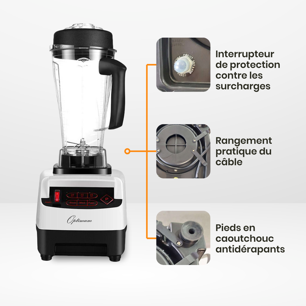 Concasse la glace en quelques secondes L'Optimum est un mixeur professionnel puissant qui peut atteindre une vitesse de (rotations par minute), il concasse la glace en quelques secondes, produit des boissons onctueuses avec une superbe consistance et aucun morceau.