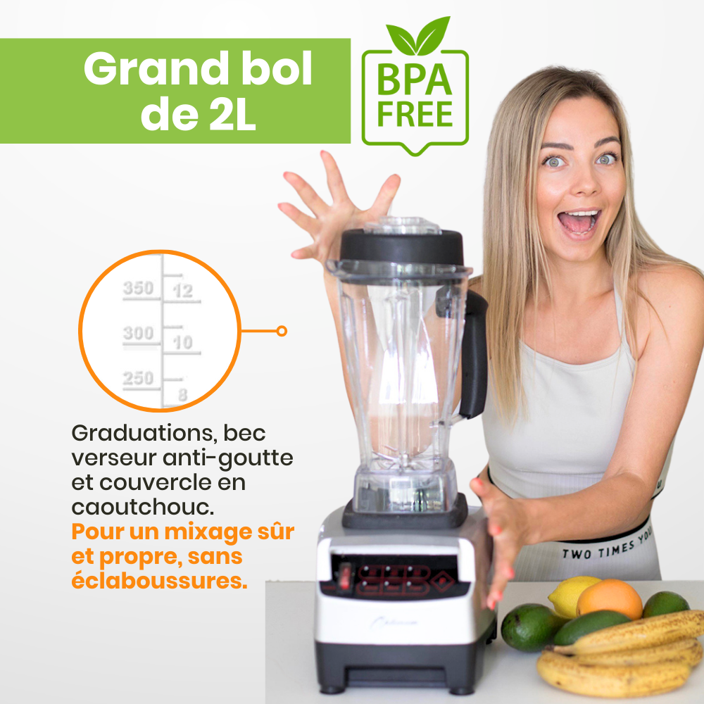 Je voulais juste te dire que j'ADORE ton mixeur. Je n'en reviens pas de la rapidité avec laquelle il a été livré ! Je fais principalement des smoothies verts au petit-déjeuner depuis que j'ai été inspirée par divers livres sur le marché. Je dois dire que je suis complètement transformée ! Les smoothies sont si onctueux et crémeux et mon petit-déjeuner prend moins de 30 secondes à mixer.