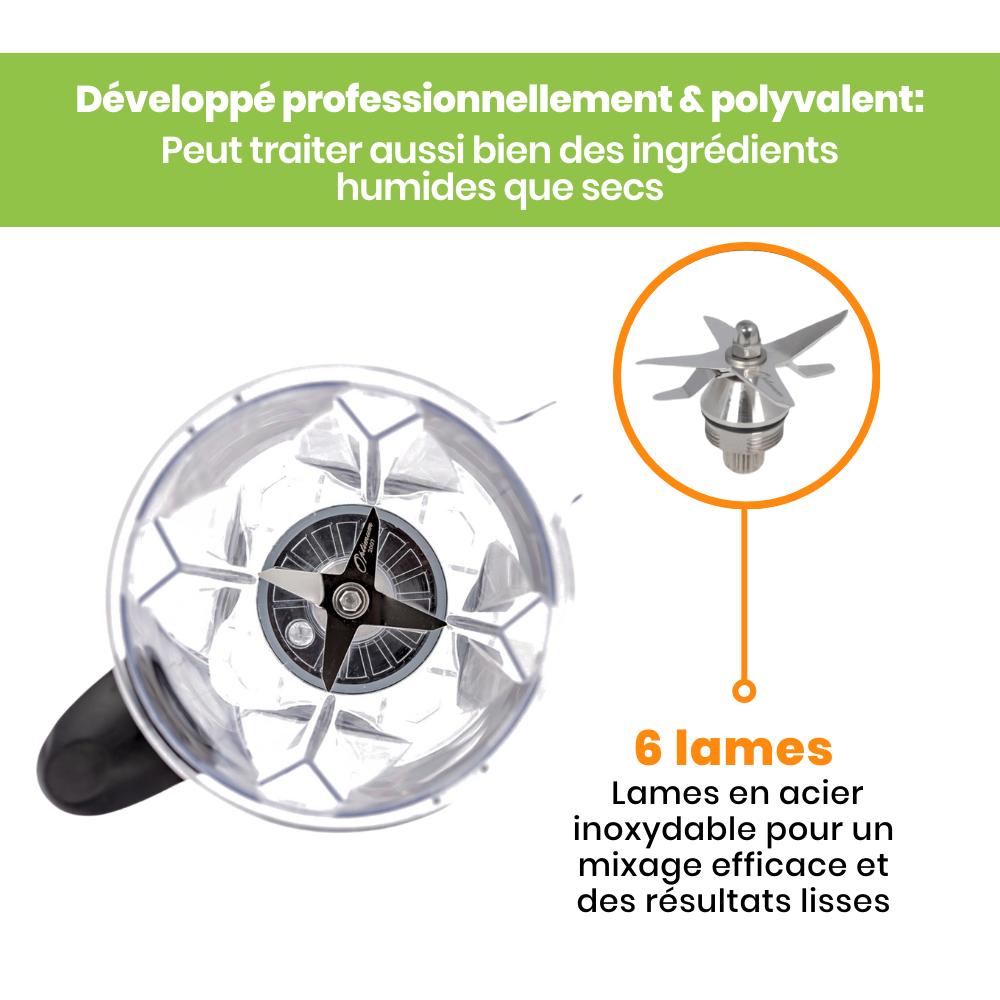 Acier inoxydable 6 lames encastrées Equipé de lames de fabrication japonaise, l'Optimum peut broyer les ingrédients les plus épais sans problème ni effort.