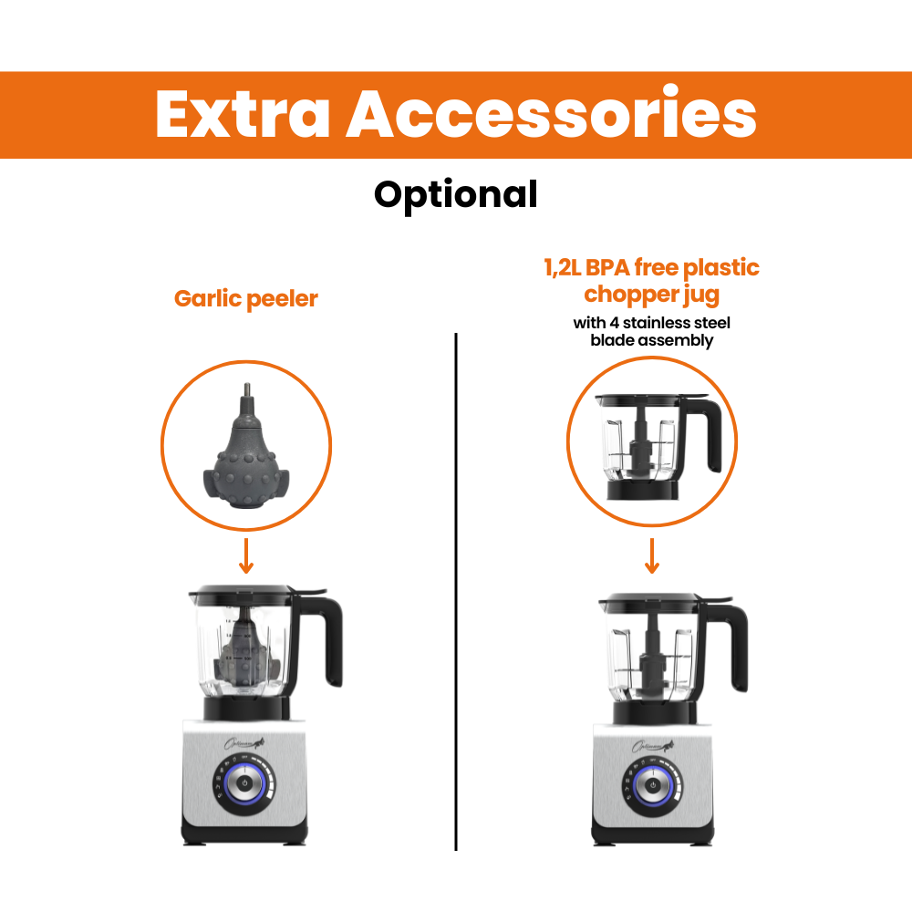 ACCESSOIRES SUPPLÉMENTAIRES : Livré avec un robot culinaire en plastique sans BPA de 1,2 L (hachoir) pour plus de polyvalence et un pichet en acier inoxydable de 1 L pour le broyage et le beurre de noix. Plus un pilon pour un mixage homogène + un éplucheur d’ail (en option).
