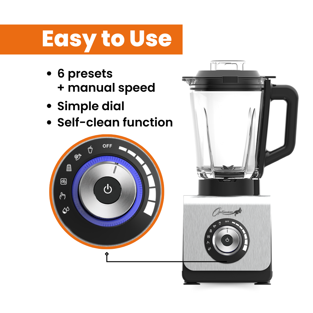Doté d’un cadran de contrôle de vitesse intuitif, le mixeur à smoothies Optimum 9400 Essential offre six fonctions automatiques préréglées. Pour ceux qui exigent un contrôle total, le cadran permet également un mixage à vitesse variable. Du mélange doux au mixage vigoureux, les possibilités sont infinies avec le blender alimentaire Optimum 9400 Essential.